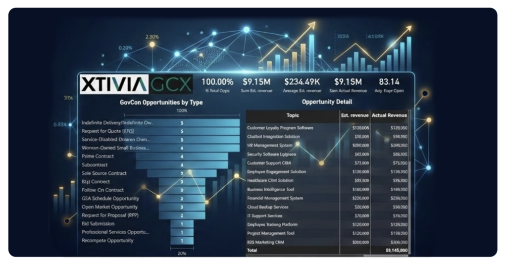 Leveraging Power BI to enable data-driven decisions by providing pre-built GovCon dashboards, which cover metrics like win rate, CLIN revenue, and backlog. Furthermore, users can build custom reports for profitability and success tracking.