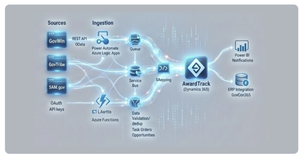 The AwardTrack solution is API-ready, enabling seamless data integration with essential GovCon intelligence feeds such as GovWin, GovTribe, and SAM.gov. This capability allows for automatic import of Task Orders, significantly reducing manual data entry and accelerating the capture lifecycle.